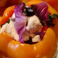 3Mix sauteed pepper and onion mix, chicken, kale, goat cheese, garlic powder, cayenne pepper, and salt together in a bowl; spoon into bell peppers to overflowing. Arrange stuffed peppers in a casserole dish. Brush coconut oil on outside of peppers, if desired.
