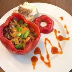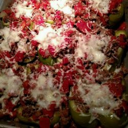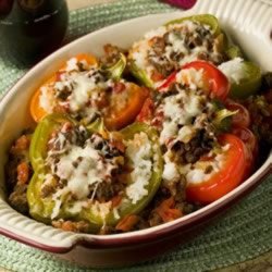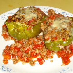 3Cut the peppers in half lengthwise, retaining stems, and remove seeds. Arrange pepper halves in a baking dish, and fill each with about 1/3 cup rice. Top with equal amounts of the meat mixture. Pour remaining meat mixture and remaining 2 cans diced tomatoes around the peppers in the dish.