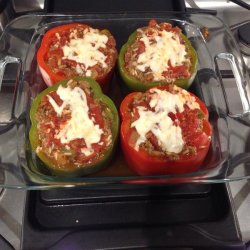 6Stir 3/4 the mozzarella cheese and 3/4 the tomato sauce into ground beef-rice mixture. Stuff bell peppers with ground beef-rice mixture; top each with remaining mozzarella cheese and tomato sauce. Arrange stuffed peppers in a baking dish. Cover dish with aluminum foil.