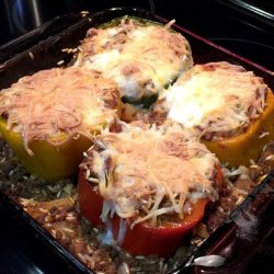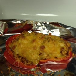 4Spoon a layer of ground beef-rice mixture into each bell pepper; top with a layer of Mexican cheese and a layer of nacho cheese-flavored tortilla chips. Repeat layering ingredients into bell peppers, ending with a Mexican cheese layer. Arrange stuffed peppers in a 9x9-inch baking dish.