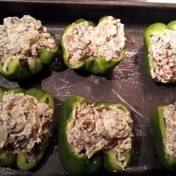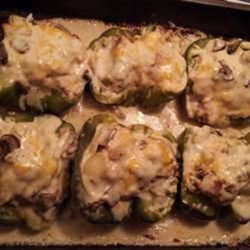 5Stuff each bell pepper with sausage-mushroom mixture; place in the prepared baking dish. Top each bell pepper with Cheddar cheese; pour warmed Alfredo sauce over and around the bell peppers. Cover baking dish with aluminum foil.