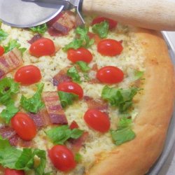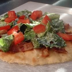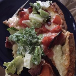 "A classic favorite is reincarnated as a pizza. Bacon and tomatoes are baked onto a pizza crust then topped with a seasoned shredded lettuce to make an unforgettably fun meal."
