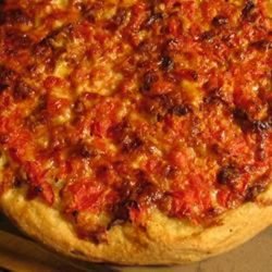 3Stretch pizza dough out over a pizza stone, pan, or cookie sheet. Brush the dough with olive oil. Spread the shredded mozzarella over the crust, and arrange the tomatoes over the cheese. Chop bacon, and sprinkle evenly over the pizza.