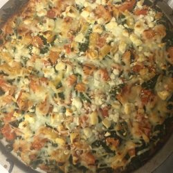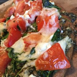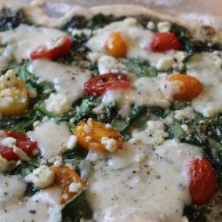 2Remove crust from wrapper and spread pesto over crust; top with a layer of spinach leaves, chopped tomato, shredded mozzarella cheese and feta cheese. Place pizza on a baking sheet.