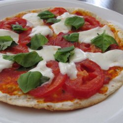 "Basil pesto, fresh mozzarella, roasted tomatoes and fresh basil leaves top a crispy flatbread for individual pizzas. Don't worry if you don't have time for the dough to rise to make the flatbread - this uses store-bought flour tortillas as an alternate base. Quick, easy and delicious!"