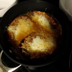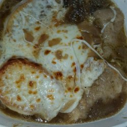 5Combine Gruyere, Emmental, Parmesan, and mozzarella cheeses in a bowl, tossing lightly. Fill oven-safe soup crocks 3/4 full of onion soup and float a bread slice in each bowl. Top with about 2 tablespoons of cheese mixture per serving.