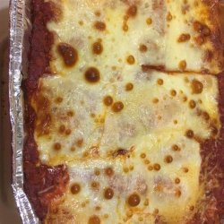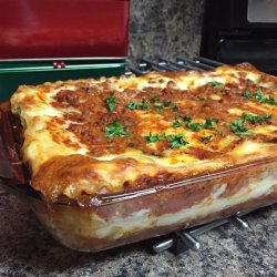 4To assemble, spread 1 1/2 cups of meat sauce in the bottom of a 9x13 inch baking dish. Arrange 6 noodles lengthwise over meat sauce. Spread with one half of the ricotta cheese mixture. Top with a third of mozzarella cheese slices. Spoon 1 1/2 cups meat sauce over mozzarella, and sprinkle with 1/4 cup Parmesan cheese. Repeat layers, and top with remaining mozzarella and Parmesan cheese. Cover with foil: to prevent sticking, either spray foil with cooking spray, or make sure the foil does not touch the cheese.