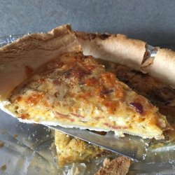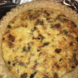 3In a large bowl, beat together eggs, milk, flour, parsley, thyme, salt and pepper. Add bacon, onion, mozzarella and cheddar cheese; mix well. Pour mixture into pie crust.