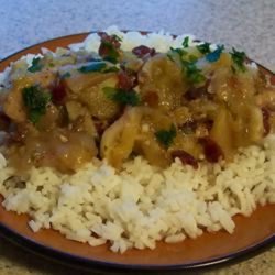 1Heat oil in a large heavy skillet over medium heat. Saute onions and garlic until soft and translucent. Move the onions to the side, and brown chicken breasts 4 minutes on each side. Top chicken with apples, currants and pine nuts. Pour in apple juice. Season with thyme, parsley, jalapeno, salt and pepper. Cover, reduce heat, and simmer for 15 to 20 minutes, or until apples are cooked and chicken is no longer pink.