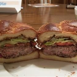 3Cook the burgers on the preheated grill until cooked to your desired degree of doneness, 4 to 6 minutes per side for well done. An instant-read thermometer inserted into the center should read 160 degrees F (70 degrees C). Spread the toasted buns with mayonnaise. Place a burger patty onto each bun bottom, then place a lettuce leaf, onion rings, and tomato slice onto each sandwich. Top with the remaining buns to serve.