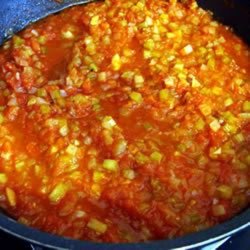 "This is a recipe I made up because I really wanted some salsa and tortillas; however, I was out of salsa. Tomato and celery along with some other ingredients are sauteed in oil and then simmered in tomato juice. It's a quick fix when you have no salsa. Warm tortilla chips go well with this salsa. Just pop some chips in the oven under the broiler for a few minutes until lightly browned."