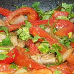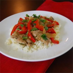 4Add remaining 1 tablespoon oil to wok; stir in onions until slightly softened, about 3 minutes. Stir in red bell pepper for 3 more minutes. Return pork to wok. Add lime juice and 1/2 cup cilantro. Cook and stir until cilantro has wilted, about 1 minute.