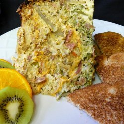 1Lightly grease a 4 quart or larger slow cooker. Place 1/3 of the hash brown potatoes in a layer on the bottom. Layer 1/3 of the ham, onion, green pepper, and Cheddar cheese. Repeat layers two more times. In a large bowl, whisk together eggs and milk, and season with salt and pepper. Pour over the contents of the slow cooker.