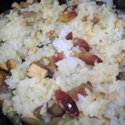 1Heat the vegetable oil in a wok or large skillet over medium high heat. Stir in the grapes and chicken; cook and stir until the chicken is hot, and the grapes are tender, about 3 minutes. Add the rice and chicken broth; continue cooking until the rice is hot, about 2 minutes more.