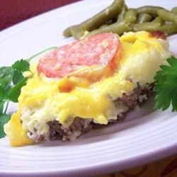 3Sprinkle meat with salt, black pepper, and oregano. Arrange tomato slices over meat, spread shredded cheese on top.