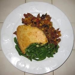 4Pour into a greased 2 quart casserole dish. Bake at 350 degrees F (175 degrees C) for 25 minutes. Put the cheese on top for the last 5 minutes of baking.
