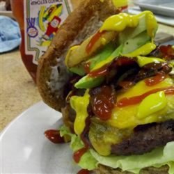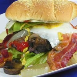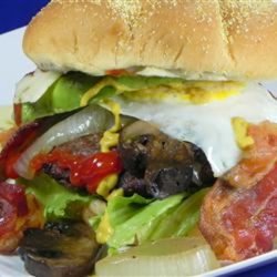 "This massive venison burger is sure to do you in. Pile it high with a fried egg, maple bacon, avocado, caramelized onions, sauteed 'shrooms, thick slab of cheese -- and rest it on a foundation of iceberg lettuce with fresh tomato. Don't forget the toasted Kaiser roll and onion rings. Welcome to the World of Gluttony. Fire Dept. tested and approved."