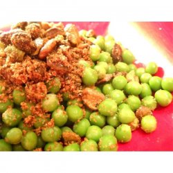 2Bring a large saucepan of water to a boil. Cook the frozen peas in the saucepan of boiling water for about 3 to 4 minutes, until heated through but still bright green. Drain peas in a colander, and return to the saucepan. Pour the pistachio-crumb mixture over the peas, mix well, and serve hot.