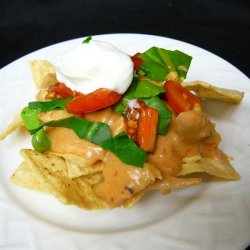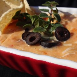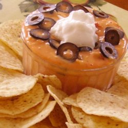 2Heat cheese mixture on high in microwave, stirring after 1 minute and every 30 seconds thereafter, until cheese is melted, about 3 minutes. Top with sour cream and olives and serve with tortilla chips.