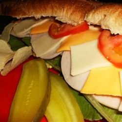 2Slice the loaf of French bread HORIZONTALLY into 5 equal layers. Spread bottom layer with horseradish, top with roast beef. Place the next slice of bread over beef, spread with mustard and top with ham and Swiss cheese. Add next slice of bread, spread with mayonnaise and top with turkey and cheese. Add the next slice of bread, spread with more mayonnaise top with tomato and onion. Cover with top. Brush melted butter over top and sides of loaf (if desired). Place on a baking sheet, loosely tent with heavy duty foil.