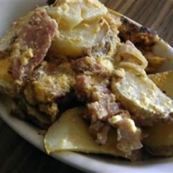 5Layer about one-third of the potatoes over the bacon, followed by half the onion and half the ham.