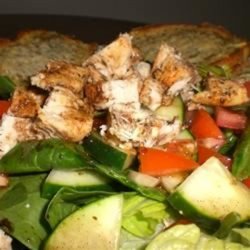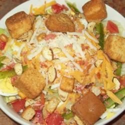 2In a large salad bowl, combine the onion, pepper, salad greens, deli meat and tomato. Sprinkle with the onion powder, garlic powder, black pepper and salt. Toss to mix.