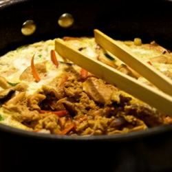 3Whisk the eggs in a bowl until well-beaten, and pour over the chicken and stock. Cover the skillet, reduce heat, and allow to steam for about 5 minutes, until the egg is cooked. Remove from heat.