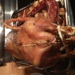 5Transfer goose to a heated platter. Remove skewer and discard string. Keep goose warm, loosely covered with foil, until ready to serve.