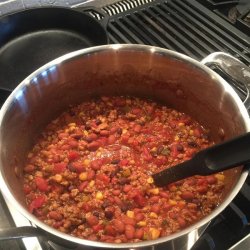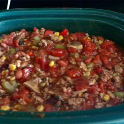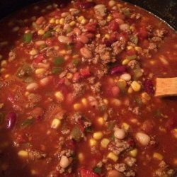 2Mix diced tomatoes, chili beans, red beans in chili sauce, yellow and white corn, black beans, chopped green chiles, barbeque sauce, cumin, chili powder, parsley, and red pepper flakes in a large soup pot. Place over medium heat, bring to a boil, and reduce heat to low. Simmer chili for 20 minutes. Stir turkey mixture into chili and simmer 15 more minutes to blend flavors.