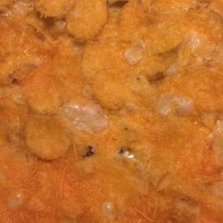 2Stir together the cream of potato soup, cream of mushroom soup and onion in a bowl. Heat in the microwave until hot, about 3 minutes. Make a layer of potato slices in the bottom of a 9x13 inch baking dish. Cover with a layer of the soup mixture and then sprinkle with some of the cheese. Repeat layers until ingredients are used up.