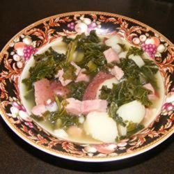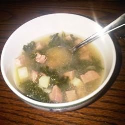 "Kale and turkey ham are simmered in chicken broth to make a hearty yet easy soup."