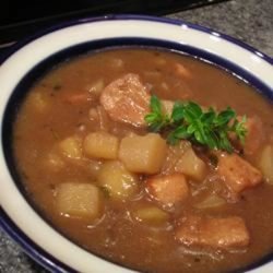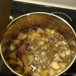 3Pour the wine and beef broth into the pot, and add the pork and apple. Cover and cook for about 45 minutes, until potatoes and apples are tender.