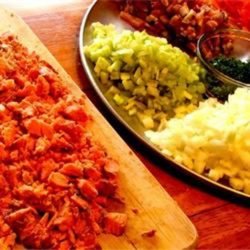 1Place the bacon into a large pot set over medium heat. Cook for a few minutes to release some of the drippings, then add the onions and celery. Cook and stir until bacon is crisp and onions and celery are tender.