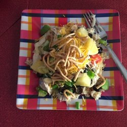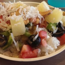 2Spread cooked rice onto a serving platter; top with chicken sauce. Layer pineapple, green bell pepper, Cheddar cheese, tomatoes, chow mein noodles, almonds, green onions, and coconut, respectively, onto chicken sauce.