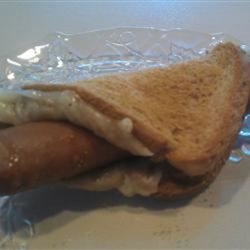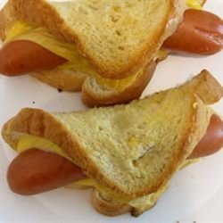 2Take 1 slice of bread and spread 1 teaspoon of butter on one side. Turn the bread over and place a slice of cheese on the bread. Place a frankfurter diagonally on the cheese. Fold bread corner to corner around the frankfurter. Insert a toothpick to hold together. Repeat steps for the remaining frankfurters.
