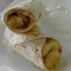 1Spread the peanut butter evenly over the middle of the tortilla; spread the apricot jelly in a layer over the peanut butter. Lie the banana atop the peanut butter and jelly layers. Drizzle the honey over the banana. Fold the two ends of the tortilla over the tips of the banana and roll the other two ends of the tortilla over the mixture to form a burrito.
