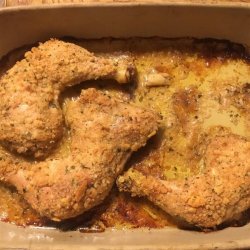 3Place coated chicken pieces into a lightly greased 9x13 inch baking dish. Drizzle with remaining garlic butter and bake uncovered in the preheated oven for 1 to 1 1/4 hours, or until chicken is cooked through and juices run clear.
