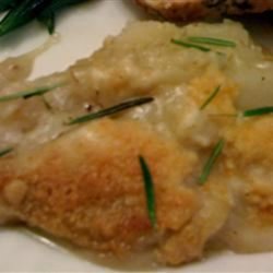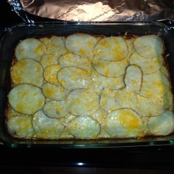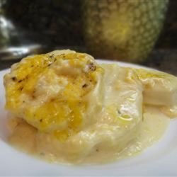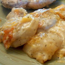 2In a blender combine soup, cream, thyme and pepper; process until smooth. Spread a thin layer of the mixture on the bottom of a 9x13 inch casserole dish. Layer potatoes with cheese, ending with potatoes and reserving 1/2 cup cheese. Pour soup mixture over potatoes and sprinkle with remaining cheese.