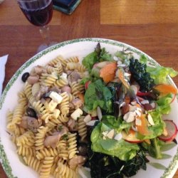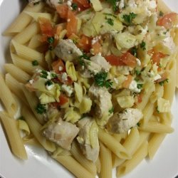 3Reduce heat to medium- low. Drain and chop artichoke hearts and add them, chopped tomato, feta cheese, fresh parsley, lemon juice, dried oregano, and drained penne pasta to the large skillet. Cook until heated through, about 2 to 3 minutes.