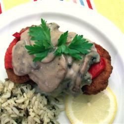 2In a large skillet, heat oil over medium heat. Dip chops in egg mixture, dredge in flour and crumb mixture, and arrange chops in hot skillet. Lightly brown chops until golden brown on both sides and cooked through. Remove from skillet, and place on prepared baking pan. Top chops with strips of roasted red peppers. Set aside.