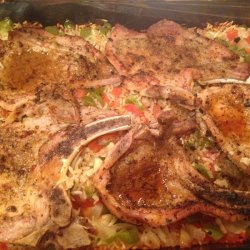 3Pour rice into prepared baking dish. Layer half the tomato slices, bell pepper strips, and onion slices onto rice. Top with 2 pork chops. Add remaining tomatoes, peppers, and onions in layers; top with remaining 2 chops. Sprinkle with marjoram, thyme, salt, and black pepper to taste. Pour consomme into the baking dish; cover.
