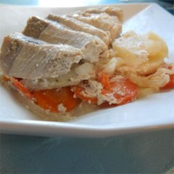 "Pork chops baked over a creamy vegetable bed of potatoes, carrots, kohlrabi and seasonings. A tasty tummy warmer for a cold night. You may substitute onion for kohlrabi if it's not available."