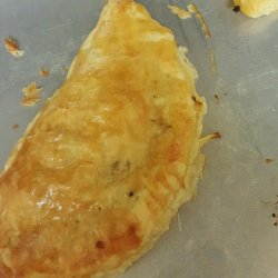 3Unfold 1 pastry sheet, keeping remaining chilled, onto a lightly floured surface, dust lightly with flour, and roll out into a 12-inch square. Cut 4 (5 1/2-inch) rounds from pastry. Brush a 1/2-inch border around edges of 1 round with water, using a small brush or fingertip. Spoon about 3 tablespoons of filling onto half of round. Fold other half over filling and press edges together firmly. Crimp edges with a fork and transfer to one of prepared baking sheets. Repeat with 3 remaining rounds. Form 12 more empanadas in same manner with remaining pastry and filling, arranging them about 1 1/2 inches apart on baking sheets.