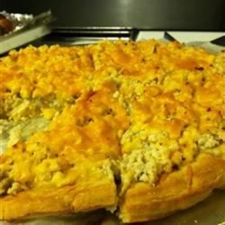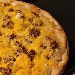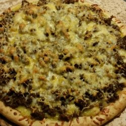 Spread cream of mushroom soup over the pizza crust. Layer cooked beef over the soup, and top with cheese.