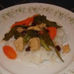 3Bring the mixture to a boil; reduce heat to medium-low, cover, and simmer until the chicken is tender, 10 to 15 minutes. Dissolve the cornstarch in 2 tablespoons of water, and stir into the simmering chicken mixture. Cook until the sauce has thickened and cleared, about 1 minute. Serve the apricot chicken over rice.