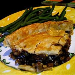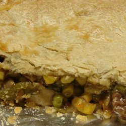 3Remove cover and add the gravy and vegetables. Stir well and simmer for 10 more minutes. Pour mixture into one pastry shell. Cover with second pastry shell, sealing edges and cutting steam vents in top. Brush edges with egg white. Place pie on a baking sheet.