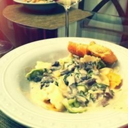 3In a medium skillet over low heat, combine wine, parsley, garlic and mushrooms; stirring frequently, saute for approximately 5 minutes or until mushrooms are cooked through.