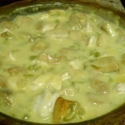 2In a large skillet over medium heat, saute the onion, celery and green pepper in butter or margarine. Add the cream of chicken soup, cream of celery soup and water and simmer all together until hot.