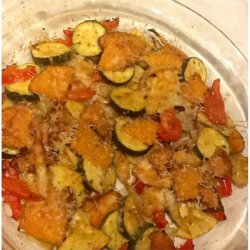 3Transfer vegetable mixture to a casserole dish; sprinkle vegetables with Cheddar cheese and bread crumbs. Spray top of casserole with butter-flavored cooking spray.