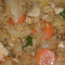 2Heat oil in a wok or frying pan over medium high heat. Brown chicken. Add carrots, and cook with chicken until slightly cooked. Add onions, bell peppers, sage, garlic powder, and soy sauce. Stir and cook continuously until chicken and vegetables are done, about five to ten minutes.